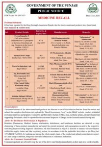 ڈرگ کنٹرول پنجاب کے مطابق درج ذیل ادویات کے مخصوص بیچز کو معیار کے تقاضوں پر پورا نہ اترنے کی وجہ سے مارکیٹ سے ہٹایا جا رہا ہے:
